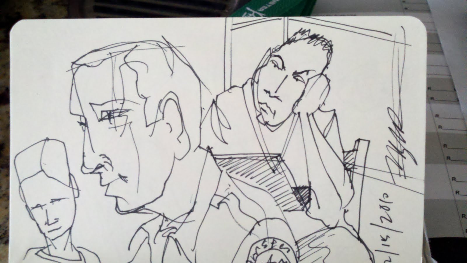 On evaluating the subject I chose the single most distinctive aspect, and I would draw that very loosely and expressively. Then I would fill in the supporting details. If nothing else, I felt, after the fact that, oh yeah, that's the guy with the mustache, or with the big smile. These things helped me enjoy what I considered a successful drawing session.